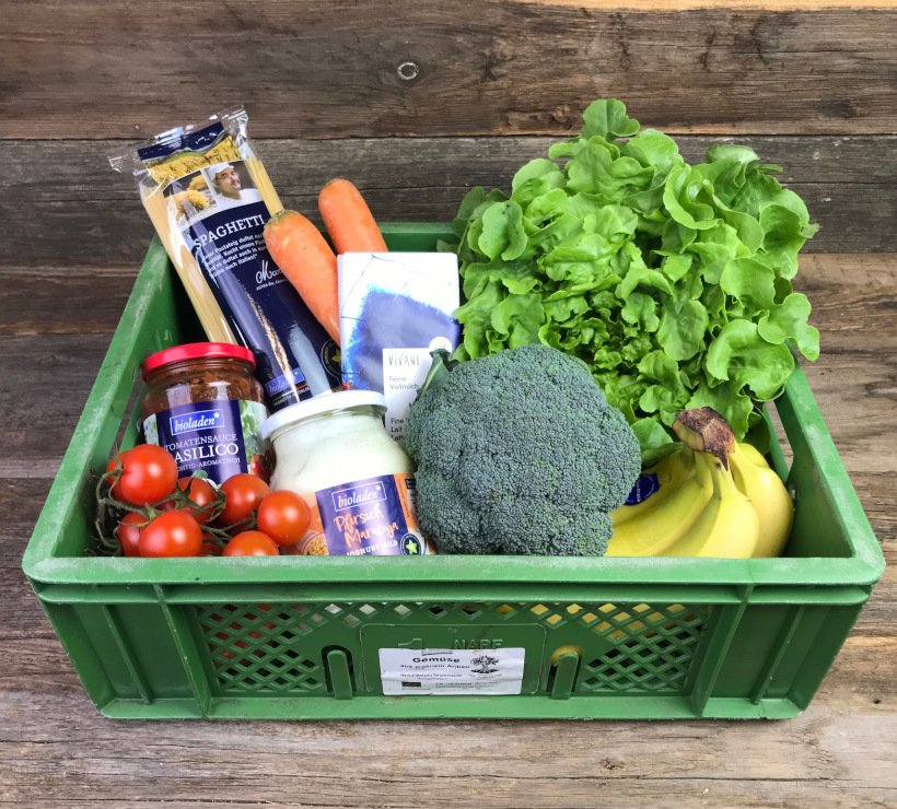 Die Kiste enthält eine Zusammenstellung aus unserem Sortiment. Neben frischem Obst und Gemüse sind auch Nudeln mit Sauce, Brot, Joghurt und eine Tafel Schokolade enthalten.